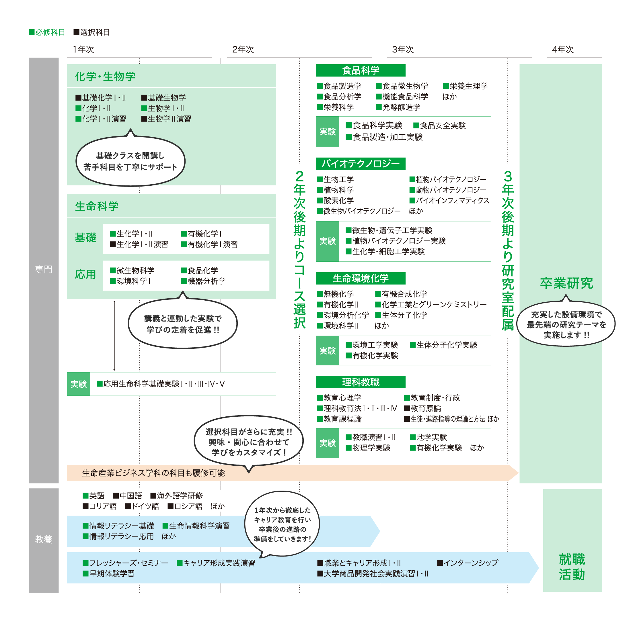 応用生命科学部では入学後様々な分野の学びを経験した後、1 人 1 人の希望や適性を踏まえ、2年次後半から各専門コースに分かれて学びをふかめていきます。