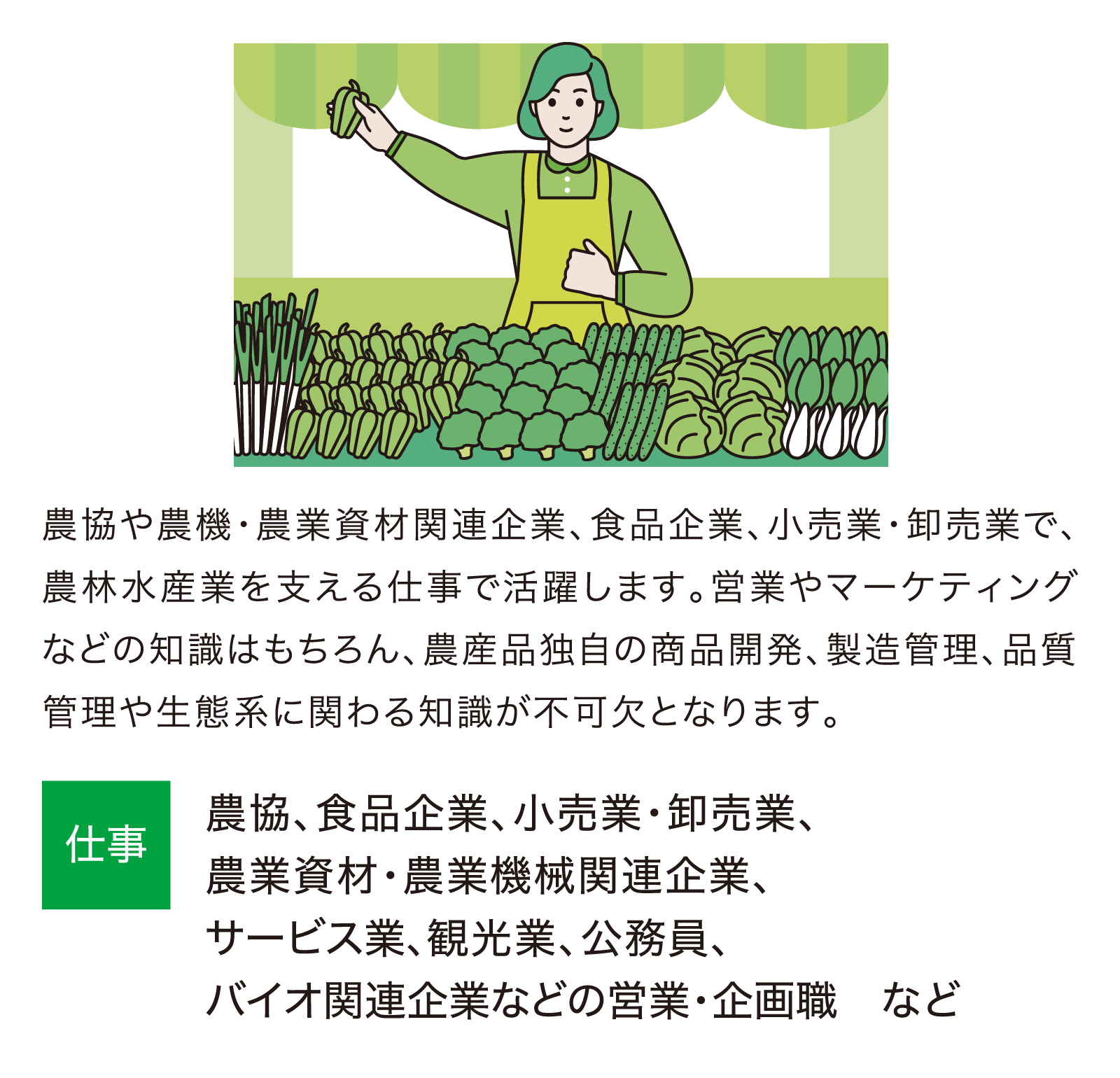 食・バイオ・環境・化学・教員それぞれの学びを網羅的に学びそれぞれの未来を実現できるプログラム設計となっています。