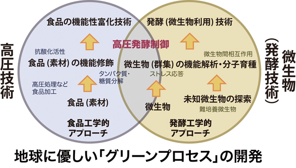 ②発酵技術の利用:発酵は微生物の機能を利用した省エネルギー型の食品製造技術として発展してきました。発酵制御のための微生物の圧力死滅(不活性化)機構に関する研究、微生物間相互作用に関する研究、さらに未知の微生物の探索等を通じて、知られざる微生物の機能を引き出し、食品製造技術にとどまらず様々なフィールドに貢献していきます。