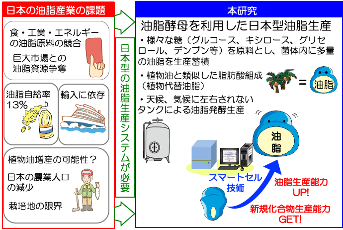 近年、新興国の成長とともにエネルギー、食糧などのあらゆる資源の需要増加に拍車が掛かってきている。このような需要増は、資源争奪戦、価格の乱高下を引き起こし、さらに地球温暖化問題への影響も多大である。このような状況は、我々の生活に深い関係がある油脂についても当てはまり、需要、価格で大きな変動が起こっている。三大栄養素の一つに数え上げられる油脂は、食用用途が多くを占めるが、年間1千億円以上の輸出総額を誇る工業用(界面活性剤、香粧品、高級アルコールの原料等)、さらには燃料用(バイオディーゼル)にも利用され、非常に需要が高い物質である(図1)。しかしながら、日本の油脂自給率はわずか13%であり、今後、食用、工業用、燃料用の油脂原料の競合やアジアの巨大市場との油脂資源の争奪が予想され、日本の安定的な油脂原料の確保は急務である。日本の油脂原料確保法の一つとして、植物油の増産があげられるが、日本の農業人口の減少、海外油脂との価格競争、栽培面積の限界、天候に依存するなど、さらなる植物油の生産増大は困難である。そのため、日本の高い技術力を活かした独自の油脂生産システムが必要となる。日本は、古くから微生物の能力を利用した味噌、醤油、酒などの産業が発展してきており、そのノウハウにより、医薬品、食品、化学メーカーの企業化の発端となってきた。本研究では、油脂生産酵母を最大限利活用することで、日本独自の油脂生産システムの基盤を構築し、自給率向上へ繋げることを目的としている。また、バイオテクノロジー技術だけでなく、情報科学のデジタル技術を融合した【スマートセル技術】を活用し、油脂酵母の油脂生産の潜在能力を引き出し、さらに新しい能力を付与し、健康的な付加価値の高い油脂生産に繋げていく研究を行っている(図2)。
