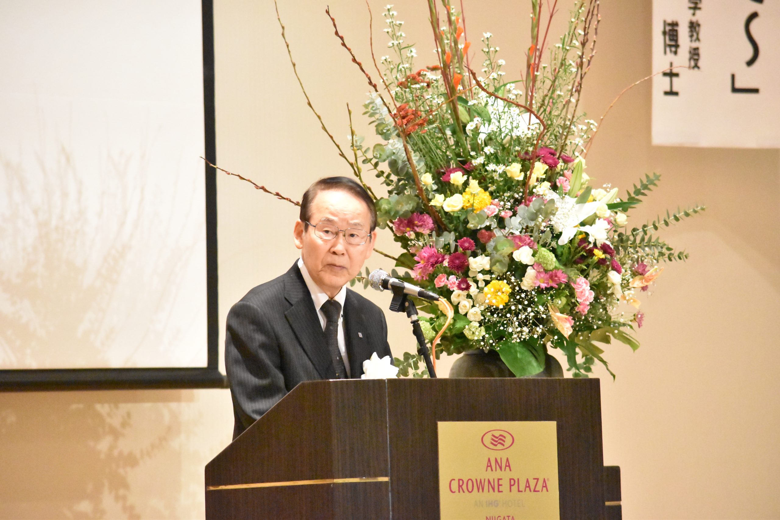 今年は、2023年4月にスタートした医療技術学部と看護学部の開設を記念し、「記念行事の部」を設け、本学学長による御礼のご挨拶と、ご来賓からは新学部開設を祝うご挨拶をいただきました。同会には笠鳥公一新潟県副知事はじめ、300名を超える新潟県内外の関係者の皆様が出席されました。