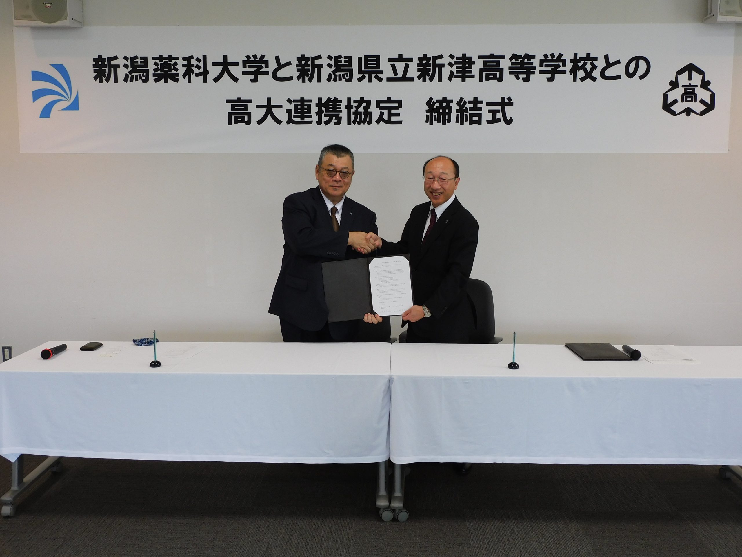 新潟薬科大学は、新潟県立新津高等学校(両校とも新潟市秋葉区に位置)との間で、7月22日(月)に「高大連携協定」を締結しました。締結式は本学新津キャンパスにおいて、新津高校の先生方をお迎えして執り行いました。