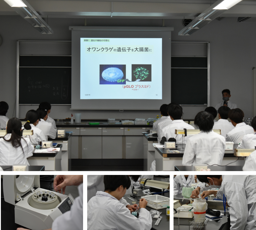 この講座は、「遺伝子機能の可視化と遺伝子産物の抽出~形質転換による大腸菌のGFP(緑色蛍光タンパク質)産生とその抽出~」をテーマとし、大学の実験設備を活用した本格的な生命科学実験を行いました。高校生は、準備段階から実験操作・データ観察までの一連のプロセスを体験し、大学ならではの高度なバイオ実験を深く学ぶ機会となりました。