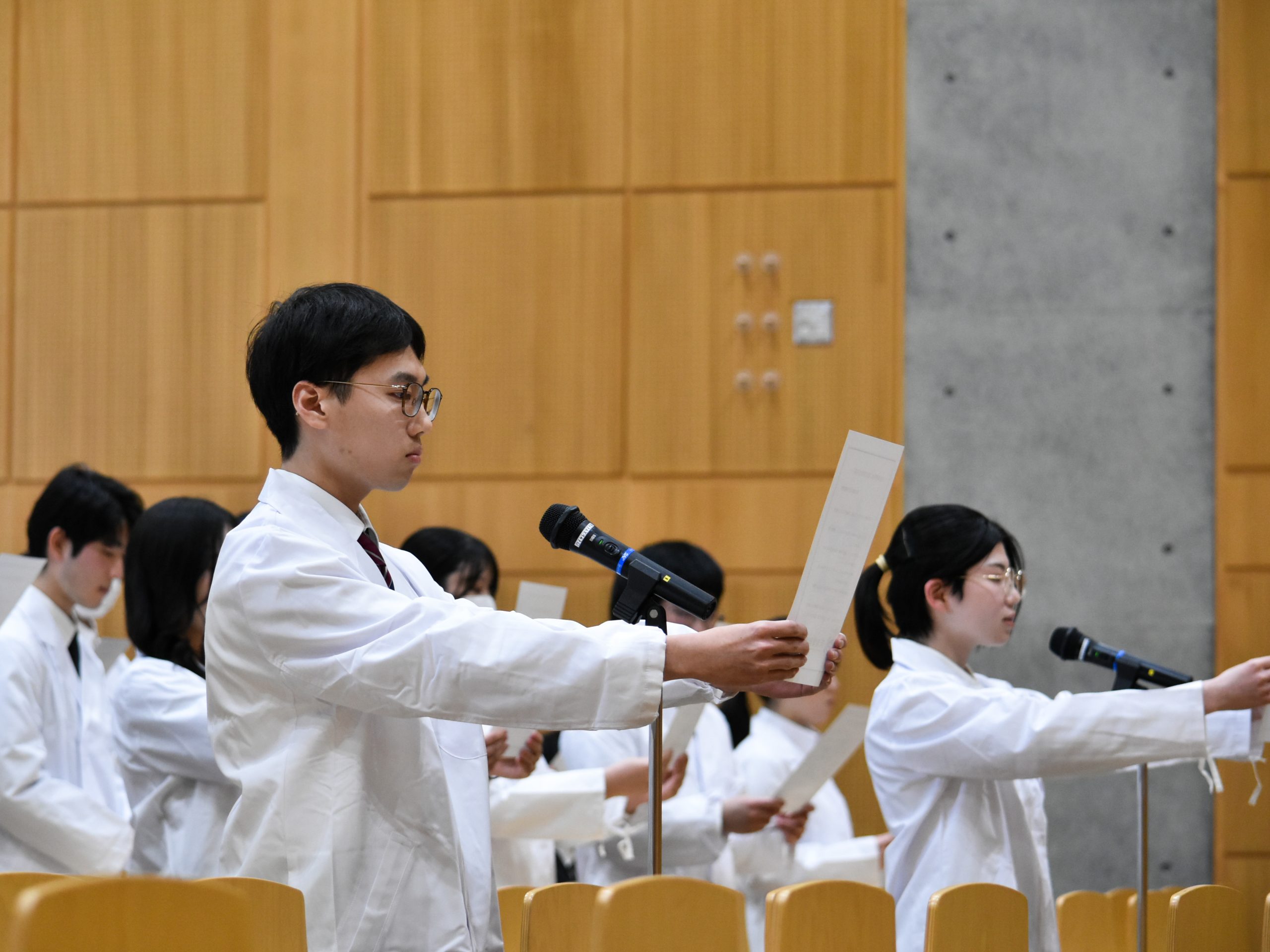 式典では、朝倉臨床薬学教育研究センター長による開会の辞に続き、久保田薬学部長より訓示が述べられました。また、5年生の代表者から後輩に温かい激励のメッセージが贈られました。学生は、多くの保護者や教職員に見守られる中、医療人の証である白衣に袖を通し、全員で誓いの言葉を唱和しました。学生代表は、結びに「感謝の気持ちを忘れず、成長した姿で仲間や先生方と再会できるよう、真摯に取り組むことを誓います。」と述べ、宣誓を行いました。