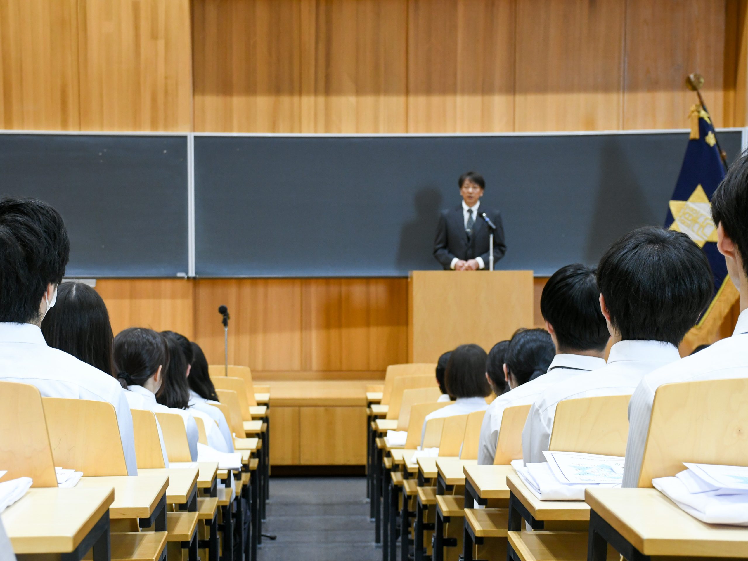 1月28日(水)新津キャンパスJ201大講義室において、令和8年度ホワイトコートセレモニーを挙行しました。同式典は、薬局・病院での臨床実務実習に臨む4年生を対象に、医療人としての自覚を促す目的で毎年実施しています。